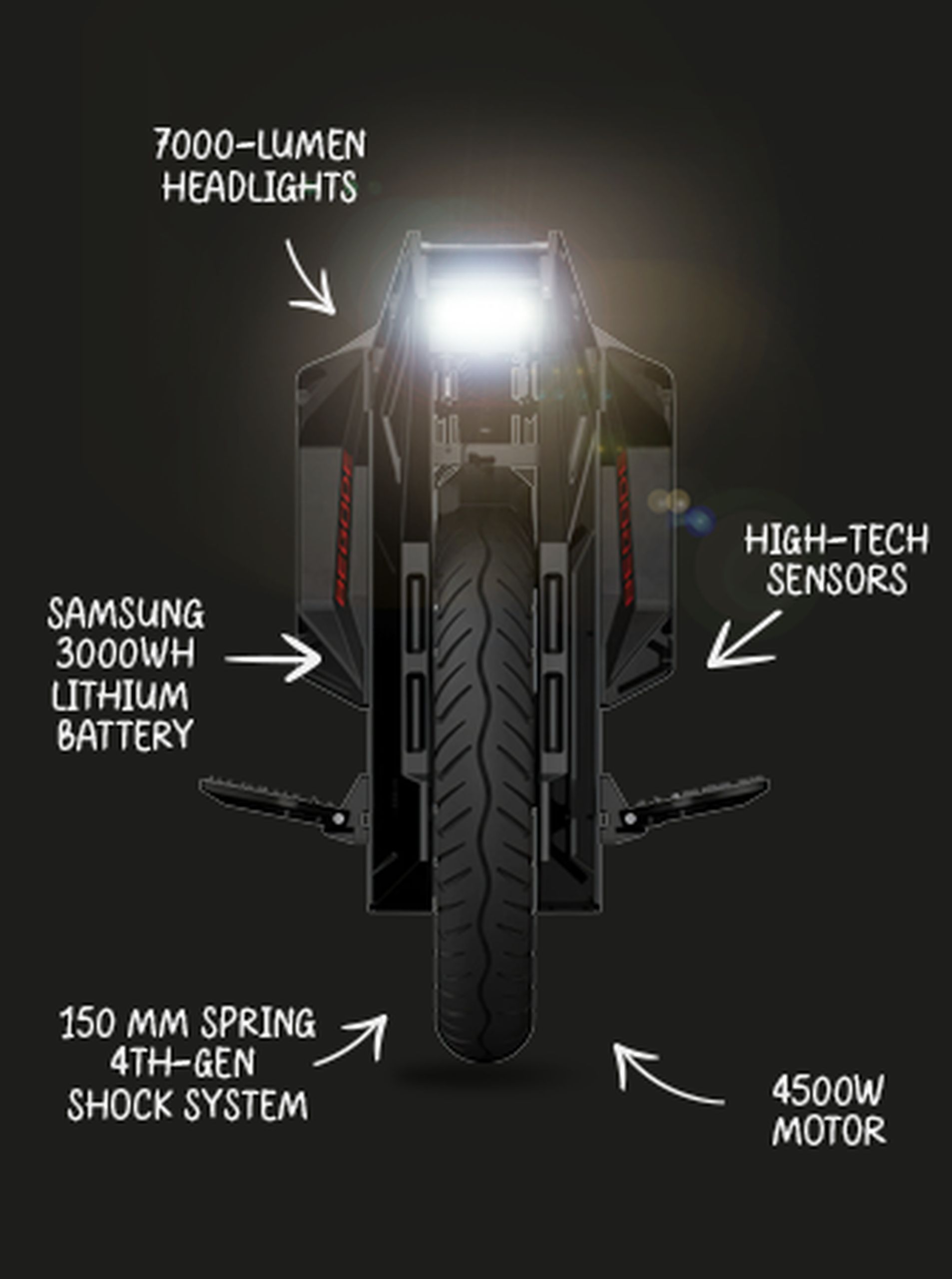 Gostaria de fazer uma pausa? O suporte integrado significa que a sua Begode ET Max descansa tão facilmente como você. Sem se inclinar, sem se deitar - basta colocá-la ao seu lado, pronta para a próxima etapa da sua viagem. Os faróis de 7000 lúmenes guiam o seu caminho, assegurando que cada viagem é tão segura como emocionante