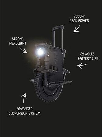 O Leaperkim Patton S é um potente veículo elétrico de uma roda que se adapta a estradas suaves e trilhos de terra. Com 80,5 lbs (36,5 kg), é construído de forma robusta com um forte motor de 3000W. A bateria grande utiliza células Samsung de alta qualidade e o conjunto assenta num sistema de suspensão ajustável que o ajuda a manter-se estável a altas velocidades.