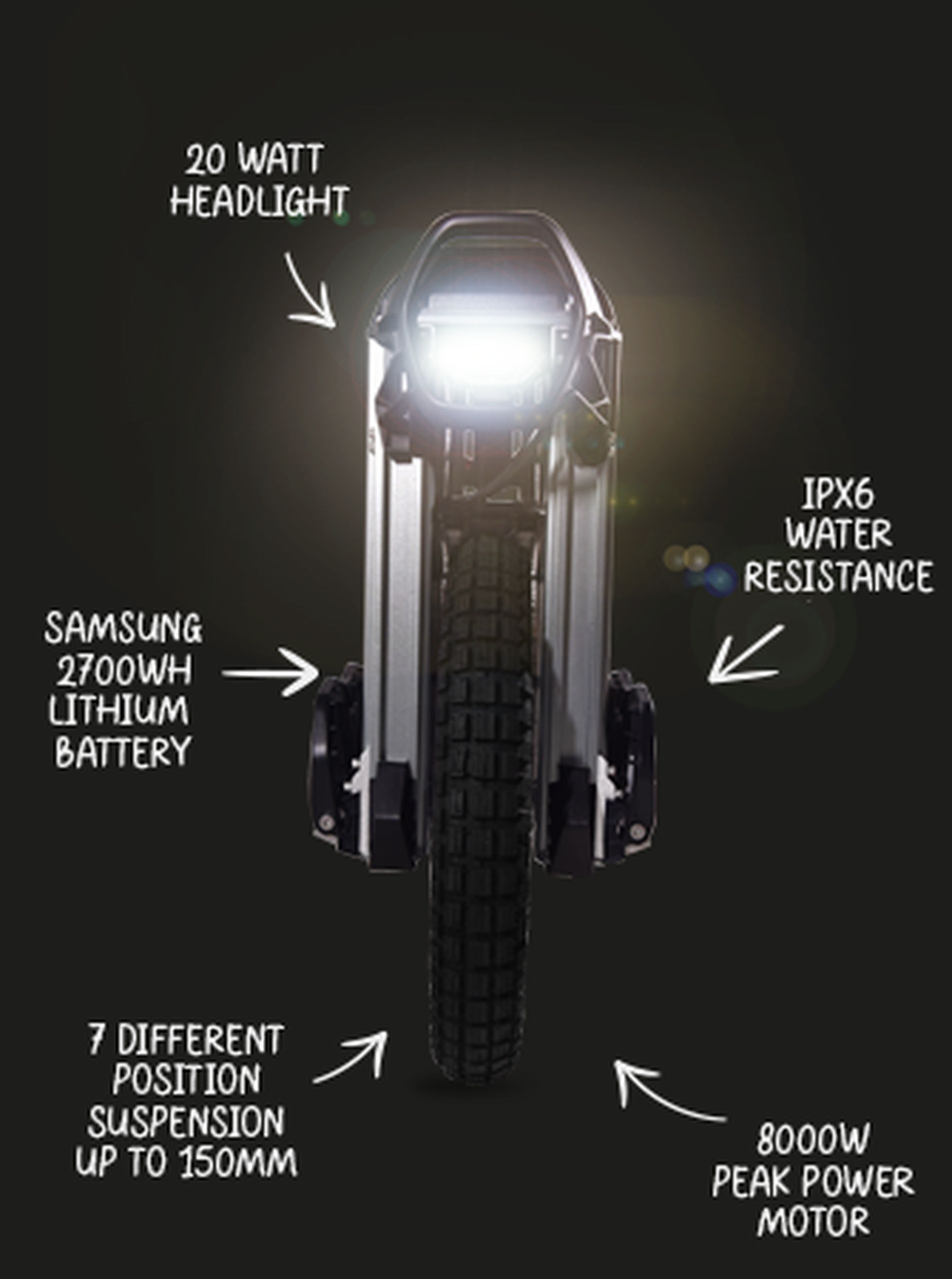 A Apex 50S tem um motor de 3200 W que pode atingir um pico de 8000 W. Esta potência é capaz de o fazer subir colinas íngremes e atravessar terrenos acidentados que fariam parar as rodas mais pequenas. Com uma velocidade máxima de 125 km/h (embora não recomendemos testar isso!), terá velocidade mais do que suficiente para qualquer situação.